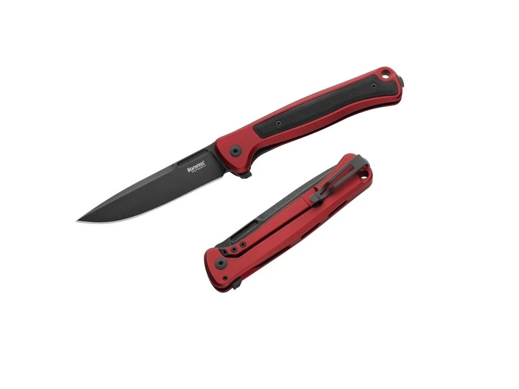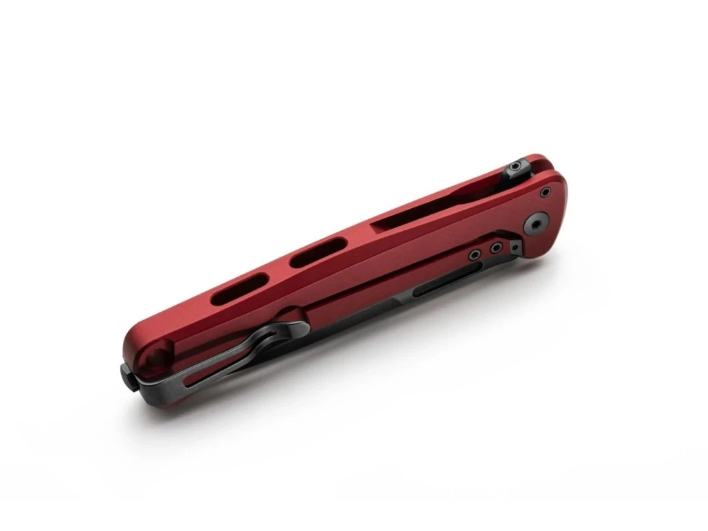 Hliníková, výrazně rudě eloxovaná, rukojeť má v hlavní části úchopu vložku z Micarty černé barvy. Hliník jako všechny kovy používané na výrobu rukojetí nožů, i hliník je velmi odolný a trvanlivý materiál. Nespornou výhodou je nízká hmotnost. Pro zlepšení úchopu je vhodná určitá textura rukojeti. Rovněž při použití v chladném počasí vás bude rukojeť chladit. V úvahu je potřeba brát, že hliník, stejně tak i jeho exkluzivnější bratr titan, jsou náchylní na poškrábání. Micarta® - materiál na stejné bázi jako G-10, avšak místo skelných vláken se používá tkanina, nejčastěji lněná. Rovněž vlastnosti Micarta jsou velmi podobné jako u G-10. Je to velmi pevný, tvrdý a lehký materiál, příjemný na dotek. Zároveň dodává noži o něco elegantnější vzhled než jiné syntetické materiály.