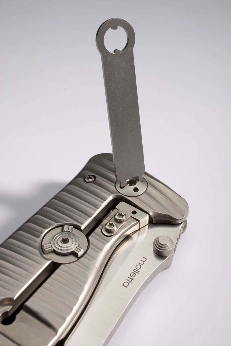 Střenka je vyrobená z hliníkové slitiny, je zdrsněná, neklouže. Klip na upevnění na kapsu od kalhot lze v případě zájmu demontovat. Na konci rukojeti je hrot na nouzové rozbíjení skla například u auta.