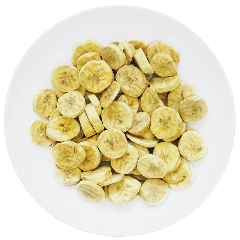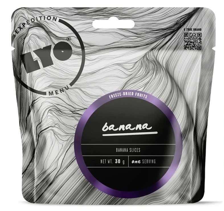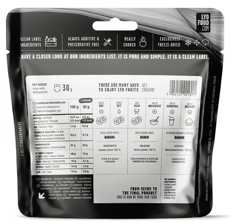 Lyofood banán: Lyofilizovaný (mrazem sušený) krájený banán bez přidaného cukru, barviv a konzervantů.