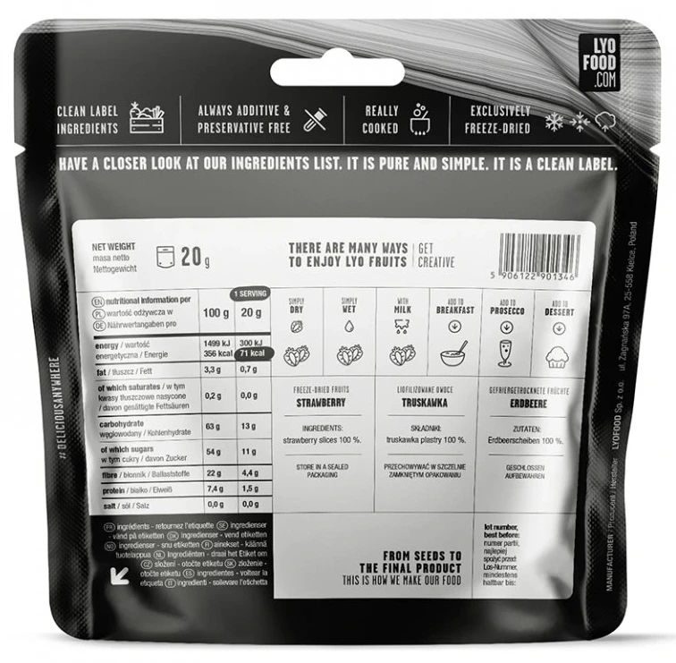 Pokrm využijete na cestách, výhodou je nízká váha a rychlá příprava. Jídlo je baleno ve speciálním hliníkovém obalu, díky němuž neztrácí chuť, barvu ani výživné hodnoty. Lyofood používá 100% přírodní a čerstvé suroviny.
