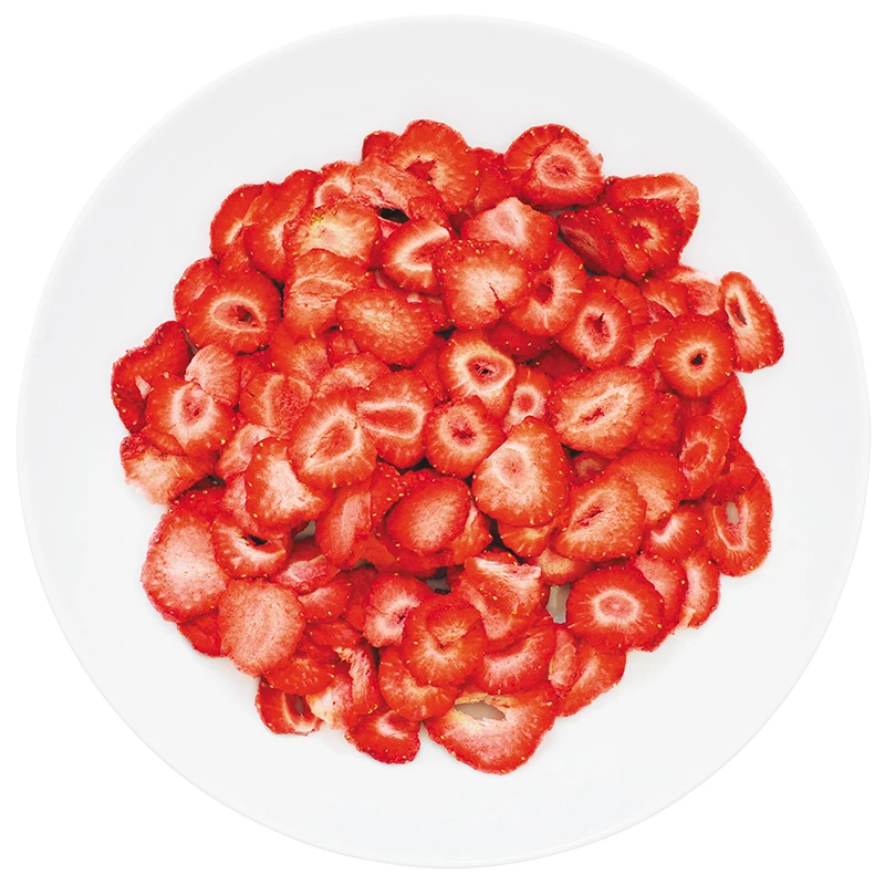 Lyofood jahody: Lyofilizované (mrazem sušené) krájené jahody bez přidaného cukru, barviv a konzervantů.