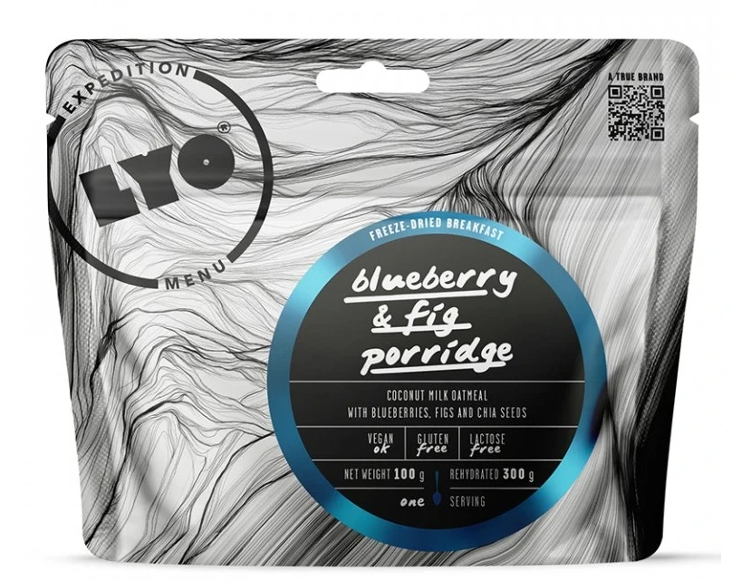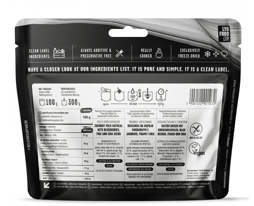 Lyofood Kokosová ovesná kaše s borůvkami, fíky a chia semínky: vynikající snídaně ze 100% přírodních surovin upravených lyofilizací (vymrazováním), skladné balení, rychlá a snadná příprava (stačí zalít horkou vodou). Tuto snídani oceníte na cestách, kde nemáte vhodné podmínky pro přípravu jídla. Pro vegetariány i vegany.
