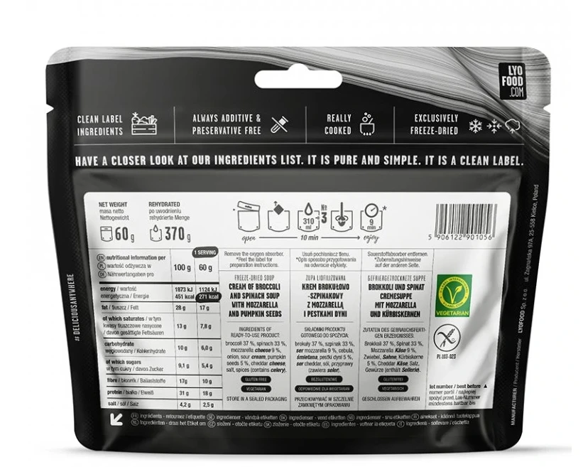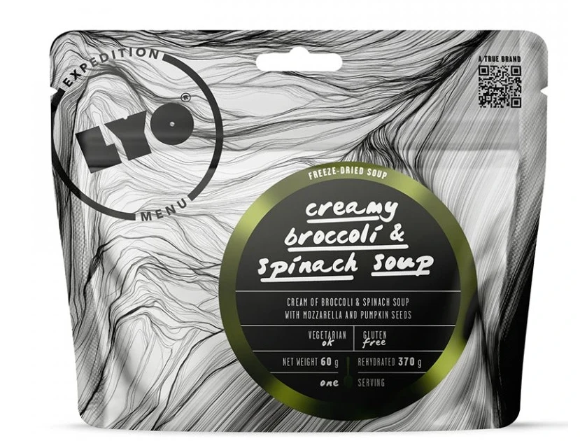 Lyofood krémová Brokolicová polévka se špenátem, mozarellou a dýňovými semínky: chutná polévka vhodná na cesty a expedice, vyniká nízkou váhou balení, snadnou a rychlou přípravou. Jídla lyofood jsou vyrobena ze 100% přírodních surovin, bez konzervantů. Jsou upravovaná lyofilizací (vymrazováním), proto neztrácejí vůni a chuť.