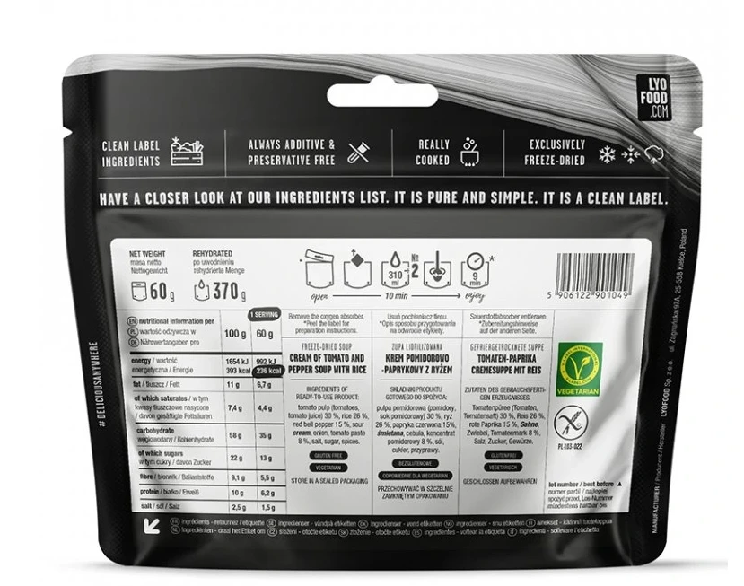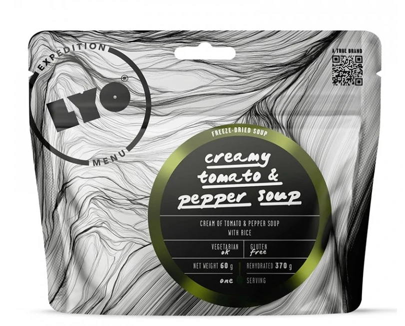 Lyofood krémová Rajská polévka s paprikou: vegetariánská polévka s červenou paprikou a rýží, zjemněná zakysanou smetanou. Polévka je vhodná na cesty a expedice, vyniká nízkou váhou balení, snadnou a rychlou přípravou. Jídla lyofood jsou vyrobena ze 100% přírodních surovin, bez konzervantů. Jsou upravovaná lyofilizací (vymrazováním), proto neztrácejí vůni a chuť.