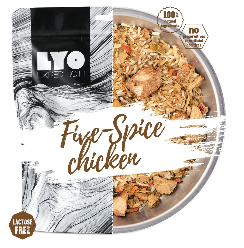Lyofood Kuře pěti chutí s rýží: je dehydrované hlavní jídlo upravované lyofilizací (vymrazováním). Suroviny používané na výrobu jsou 100% přírodní a čerstvé. Jídlo vyniká malou hmotností, skladností, rychlou a jednoduchou přípravou, přičemž je to plnohodnotná a chutná strava. Je baleno v hliníkovém obalu, do kterého stačí nalít horkou vodu a jídlo je hotové. Bez konzervačních látek. Využijete ho na expedice, tůry, pod stan, tam kde váha a rychlost přípravy hraje roli.