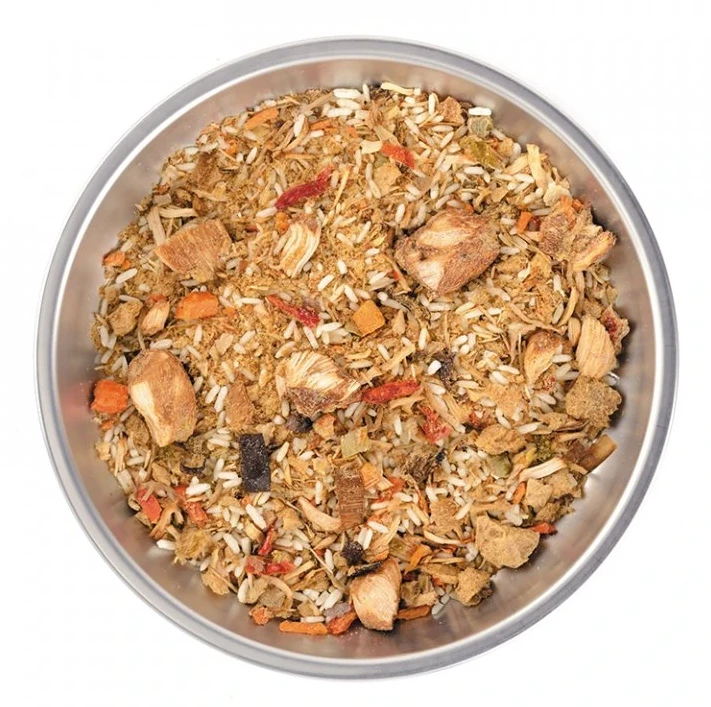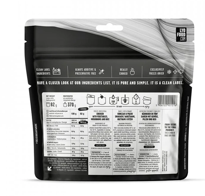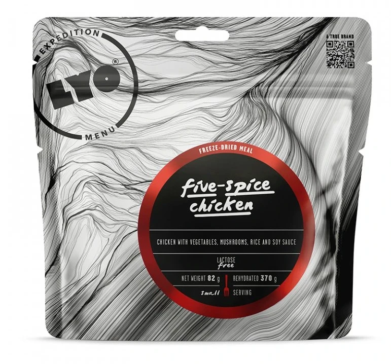 Lyofood Kuře pěti chutí s rýží: je dehydrované hlavní jídlo upravované lyofilizací (vymrazováním). Suroviny používané na výrobu jsou 100% přírodní a čerstvé. Jídlo vyniká malou hmotností, skladností, rychlou a jednoduchou přípravou, přičemž je to plnohodnotná a chutná strava. Je baleno v hliníkovém obalu, do kterého stačí nalít horkou vodu a jídlo je hotové. Bez konzervačních látek. Využijete ho na expedice, tůry, pod stan, tam kde váha a rychlost přípravy hraje roli.