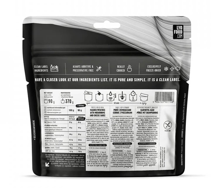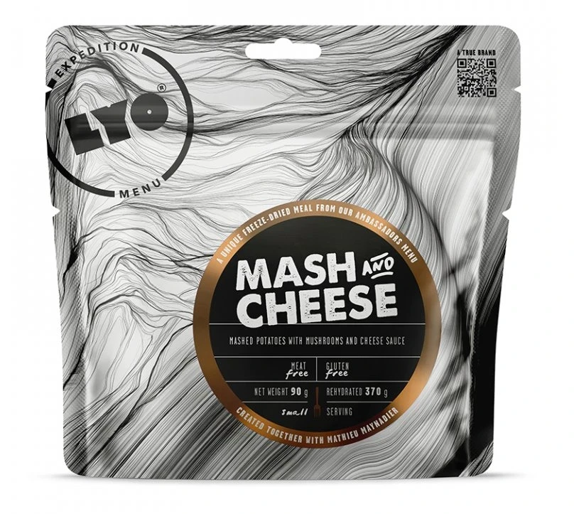 Lyofood Mash & Cheese: bramborová kaše v kombinaci s výběrem těch nejkvalitnějších sýrů spolu s ručně sbíranými houbami marinovanými v domácí worcesterové omáčce.