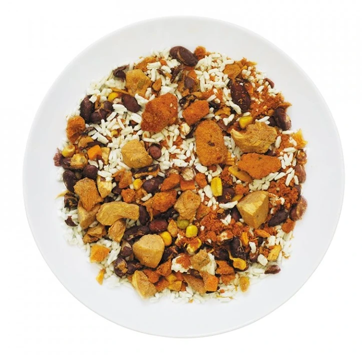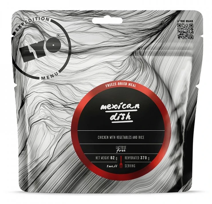 Lyofood Mexická pánev: kousky kuřete, fazole, kukuřice a zelenina s bílou rýží. Kořeněné. Využijete ho na cestách, výhodou je nízká váha a rychlá příprava. Jídlo je baleno ve speciálním hliníkovém obalu, díky němuž neztrácí chuť, barvu ani výživné hodnoty. Lyofood používá 100% přírodní a čerstvé suroviny.