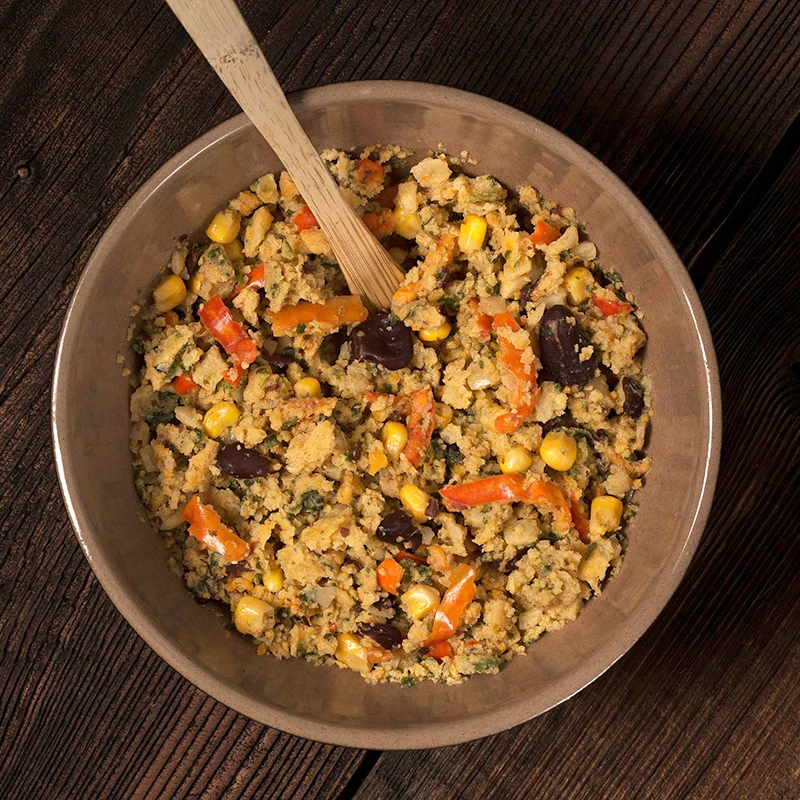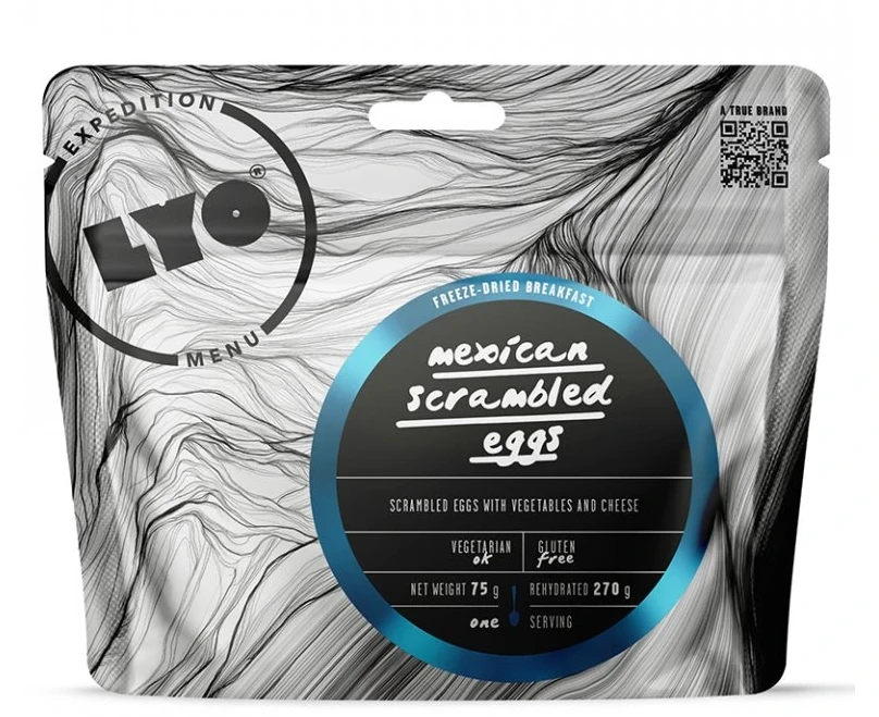 Lyofood Míchaná vejce na mexický způsob: míchaná vejce na mexický způsob s červenými fazolemi, sýrem i kukuřicí.
