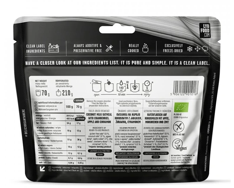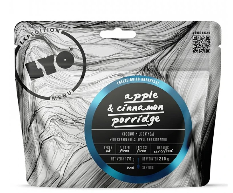 Lyofood Ovesná kaše s jablky a skořicí: je bezlepková ovesná kaše s jablky se skořicí, brusinkami a chia semínky. Tuto snídani oceníte pokud vyrážíte na cesty, expedice a nemáte vhodné podmínky pro přípravu jídla. Je to plnohodnotná lyofilizovaná strava ze 100% přírodních surovin, velmi rychle a jednoduše připravená. Snídaně je chutná, vhodná pro vegany i vegetariány.