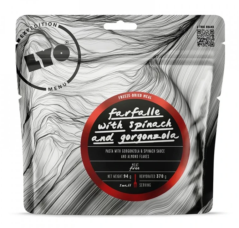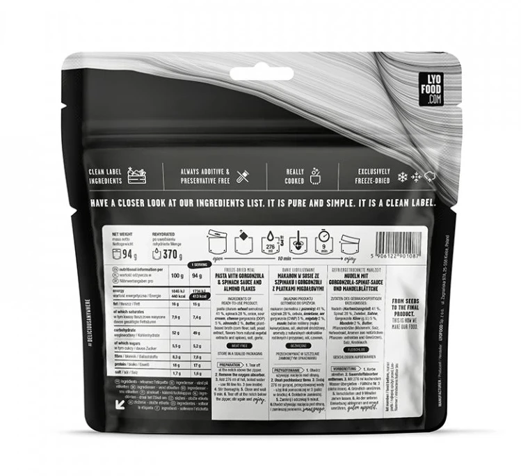 Lyofood Těstoviny s Gorgonzolou a špenátem: Kombinace těstovin se zdravým špenátem a krémovým sýrem Gorgonzola, připraveno podle italského receptu. Využijete ho na cestách, výhodou je nízká váha a rychlá příprava. Jídlo je baleno ve speciálním hliníkovém obalu, díky němuž neztrácí chuť, barvu ani výživné hodnoty. Lyofood používá 100% přírodní a čerstvé suroviny.