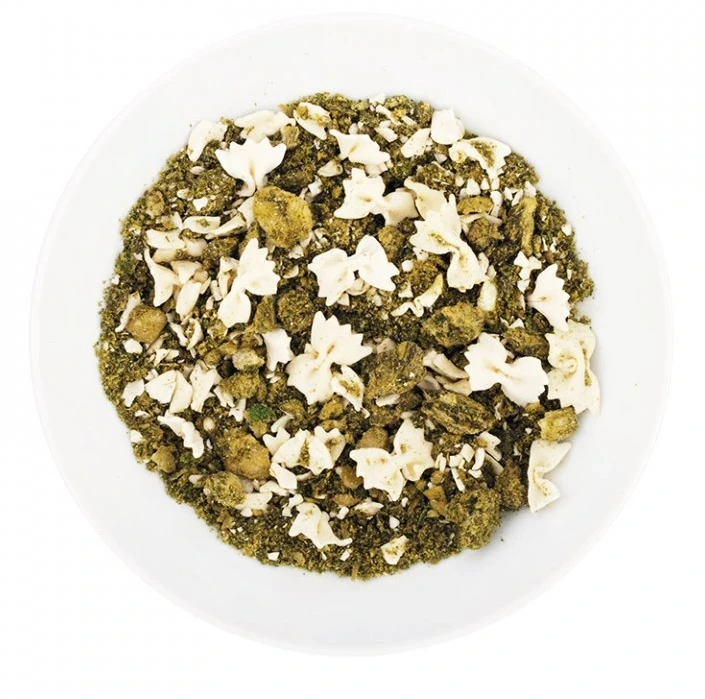 Složení: špenát 28%, těstoviny( obs. pšeničnou krupici) 41%, cibule, zakysaná smetana, Gorgonzola(DOP) 5%, mandle 2%, rostlinný vývar(kukuřičná mouka, kvasnicový extrakt a koření), sůl, česnek, máslo