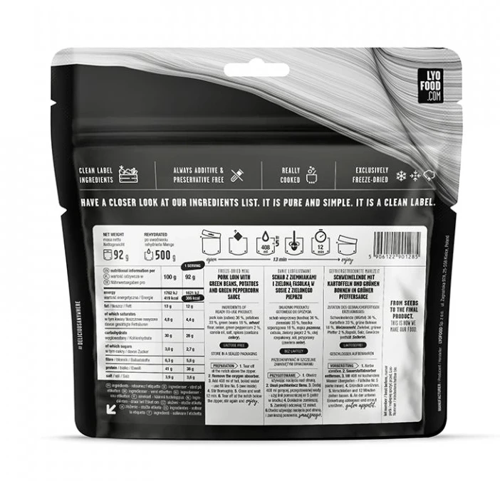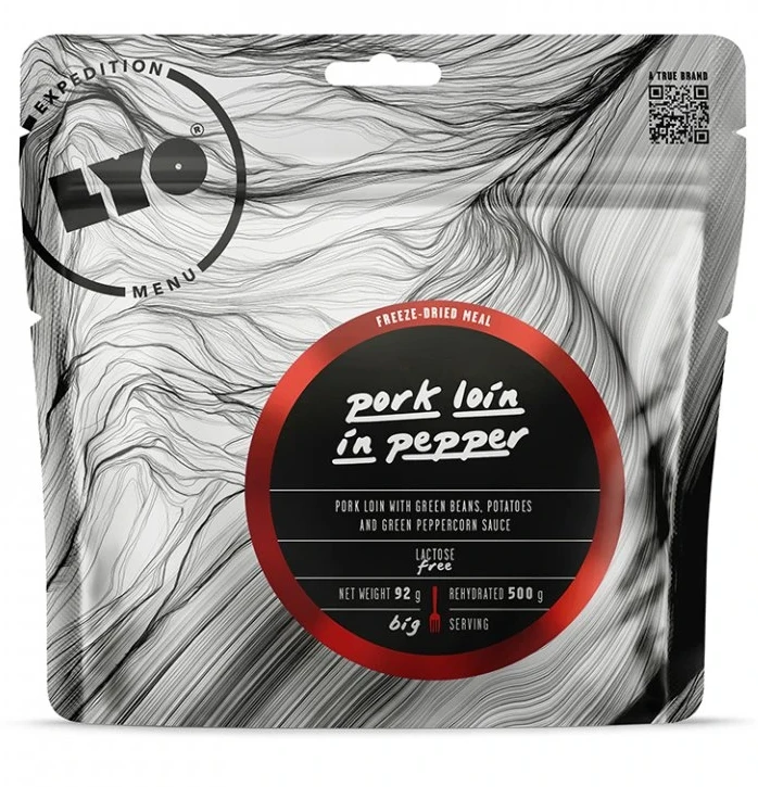 Lyofood Vepřová panenka se zeleným pepřem a bramborem: vepřová panenka s mírně kořeněné omáčce ze zeleného pepře s bramborem. Využijete ho na cestách, výhodou je nízká váha a rychlá příprava. Jídlo je baleno ve speciálním hliníkovém obalu, díky němuž neztrácí chuť, barvu ani výživné hodnoty. Lyofood používá 100% přírodní a čerstvé suroviny.