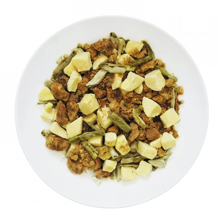 Složení: vepřová panenka 36% (kostky), brambory 33%, zelené fazole 18%, cibule, pšeničná mouka, zelený pepř 2%, kanolový olej, sůl, koření (obsahuje celer)