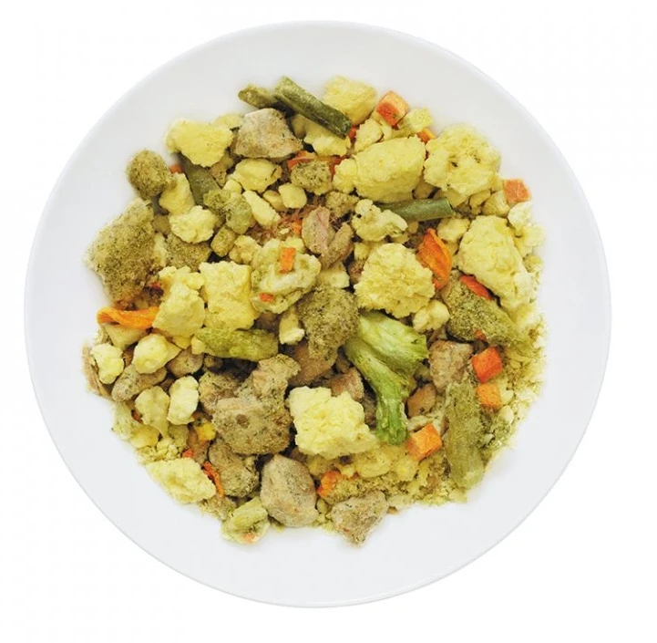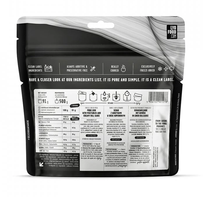 Lyofood Vepřové s koprovou omáčkou a bramborem: vepřová panenka s bramborami ve smetanové koprové omáčce. Využijete ho na cestách, výhodou je nízká váha a rychlá příprava. Jídlo je baleno ve speciálním hliníkovém obalu, díky němuž neztrácí chuť, barvu ani výživné hodnoty. Lyofood používá 100% přírodní a čerstvé suroviny.