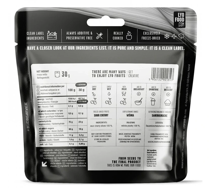 Pokrm využijete na cestách, výhodou je nízká váha a rychlá příprava. Jídlo je baleno ve speciálním hliníkovém obalu, díky němuž neztrácí chuť, barvu ani výživné hodnoty. Lyofood používá 100% přírodní a čerstvé suroviny.