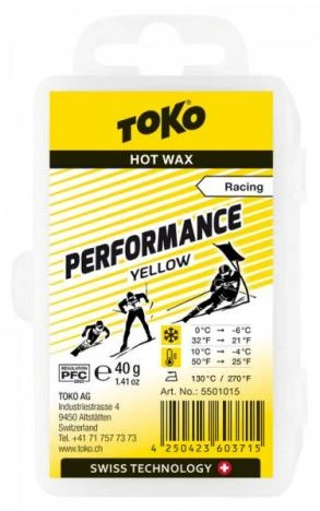 Toko Performance yellow 40g 0°/-6°C - sportovní lyžařský vosk, který zlepšuje skluz. Hodí se pro teploty 0 až –6°C. Je vhodný pro pro sjezdové lyže, snowboardy, běžky. Po navoskování lyží se zlepšuje jejich skluz díky tomu je u sjezdových lyží snadněji dělat oblouky.