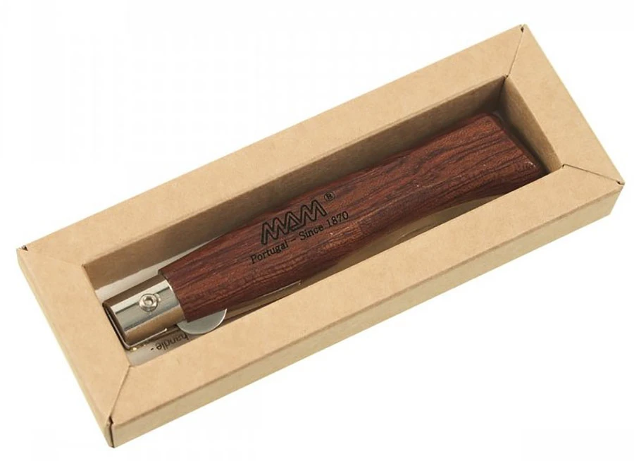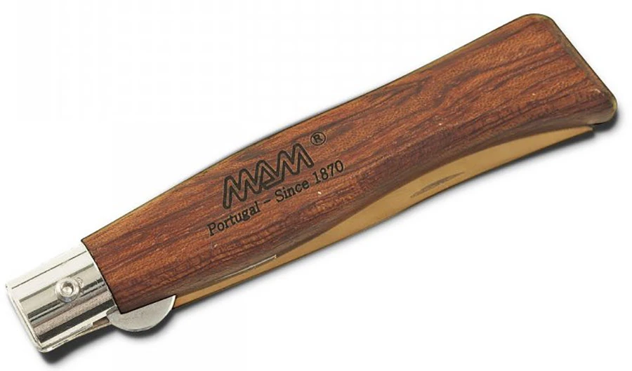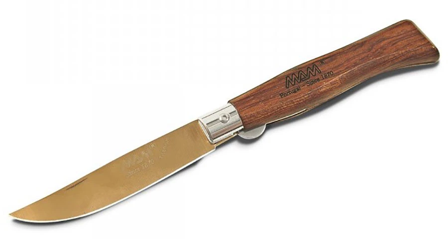Mam Douro 2084 Bronze Titanium Bubinga: kapesní zavírací nůž s pojistkou. Rukojeť je vyrobená z tmavě hnědého až červeného dřeva bubinga. Je impregnovaná, aby co nejlépe odolávala vlhkosti. Čepel s titanovou povrchovou úpravou z nerezová oceli 420 je dlouhá 8,3 cm.