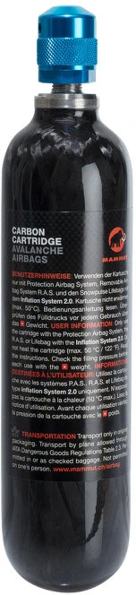 Mammut Carbon Cartridge 300 bar: náplň do Mammut Protection Airbag, Removable Airbag a Snowpulse. Je určená pouze na jedno použití, po jednom odpálení je kartuš prázdná. Ale náplň je možné v ČR doplnit, není nutné kupovat pokaždé novou kartuš.