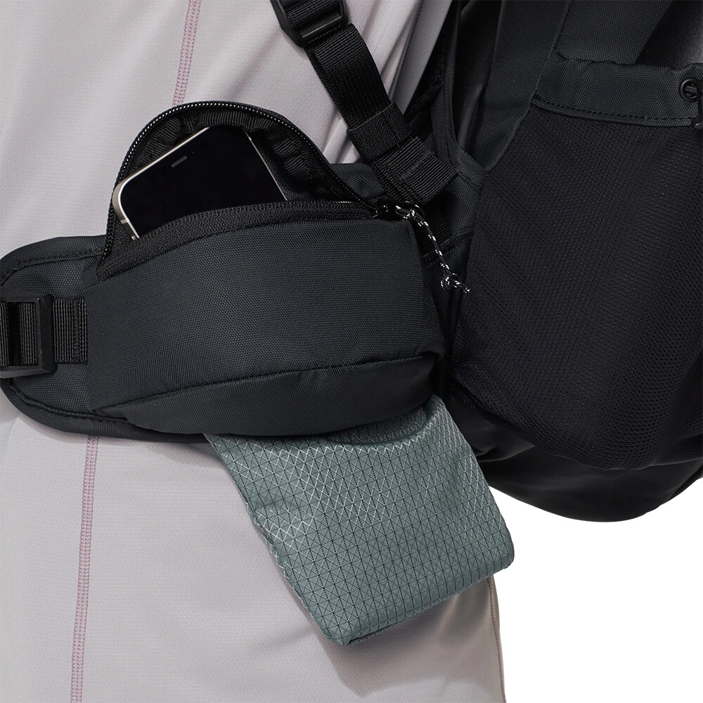 Batoh je kompatibilní s hydrovakem, má dvě kapsy na ramenních popruzích na drobnosti, rozkládací kapsu na zip na bederním pásu do které se vejde mobil a dvě boční kapsy na láhve, kapsy jsou dobře přístupné i za chůze. Dále na batohu najdete dostatečně velkou přední síťovanou kapsu třeba na bundu či pláštěnku. Poutka na přichycení turistických hůlek, integrovaná, odnímatelná pláštěnka.