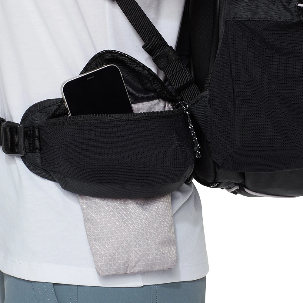 Batoh je kompatibilní s hydrovakem, má dvě kapsy na ramenních popruzích na drobnosti, rozkládací kapsu na zip na bederním pásu do které se vejde mobil a dvě boční kapsy na láhve, kapsy jsou dobře přístupné i za chůze. Dále na batohu najdete dostatečně velkou přední síťovanou kapsu třeba na bundu či pláštěnku. Poutka na přichycení turistických hůlek, integrovaná, odnímatelná pláštěnka.