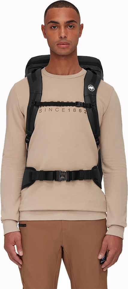 Batoh má pevný zádový systém, který je prodyšný a polstrovaný bederní pás. Uvnitř batohu najdete poutka pro uložení expresek, integrovaný vak na lano, menší kapsy.