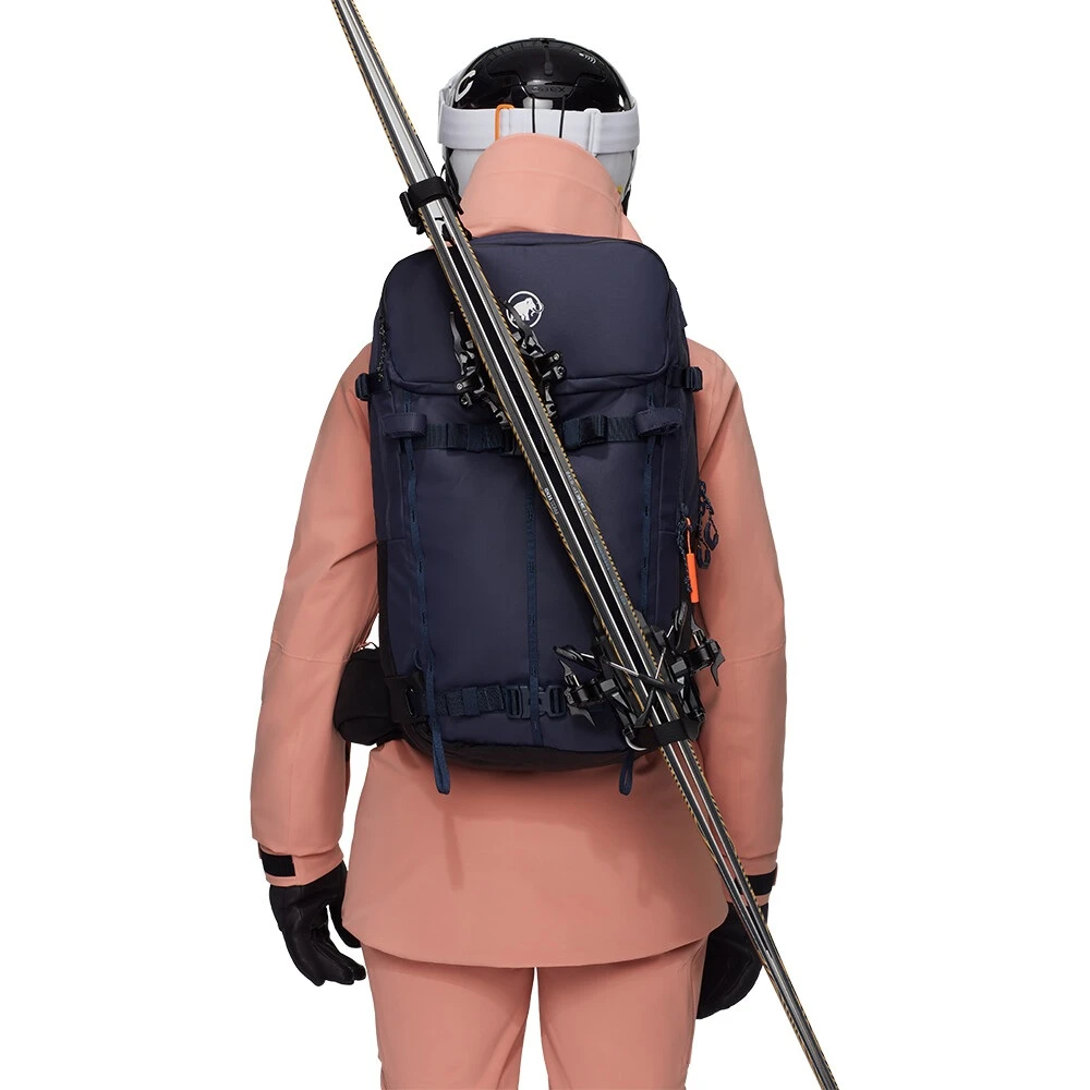 Mammut Nirvana 35 Women - batoh Nirvana 35 Women od značky Mammut je největším členem rodiny Nirvana. Stejně jako ostatní modely v této řadě nabízí vynikající vybavení pro zimní sporty. Optimalizovaný nosný systém a střih přizpůsobený ženským proporcím z něj činí ideální volbu, která zaručuje lehkost a rychlost pohybu. Ramenní popruhy přizpůsobené ženské anatomii zvyšují pohodlí při nošení, upravený bederní pás a kratší délka zad zajišťují maximální komfort a volnost pohybu. Při lezeckých úsecích můžete lyže nebo splitboard připevnit k batohu buď diagonálně, nebo ve tvaru A. V hlavní komoře najdete dostatek prostoru nejen pro náhradní oblečení, jako třeba triko, čepici, či mikinu, ale klidně i pro spacák a hygienickou taštičku v případě, že se chystáte přespat na chatě. Navíc je přístupná i přes zadní panel, takže se ke všem věcem dostanete snadno a rychle. Super je i kompatibilita s chráničem zad Mammut. O vaši bezpečnost je tak maximálně postaráno a vy si tak můžete užít každou výpravu.