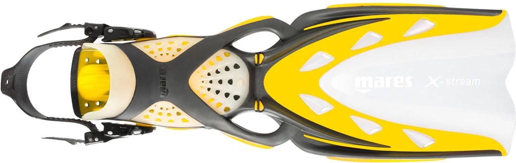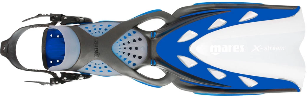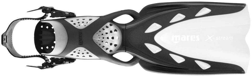 Potápěčské ploutve Mares X-Stream – ze tří rozdílných materiálů: pevné zaručují optimální přenos síly, měkké přizpůsobení tvaru chodidla a pružné maximální výkon. Vzniklé kapse na chodidlo nyní zabraňují otvory v horní a spodní části, díky kterým je kapsa pro nohu navíc mnohem měkčí a pružnější a nebrzdí při plavání. Minulostí je také přisávání nohy ke kapse a obtížné sundávání ploutví.