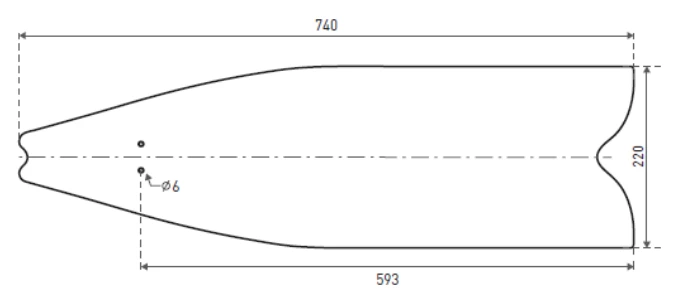 Ploutev má konstantní tloušťku listu a je 22 cm široká a 59 cm dlouhá. Výbornou zprávou je perfektní skon listu až 26 ° co optimalizuje tah a prohnutí listu.