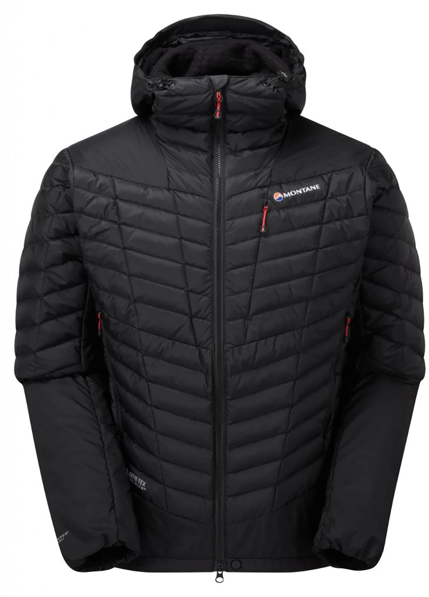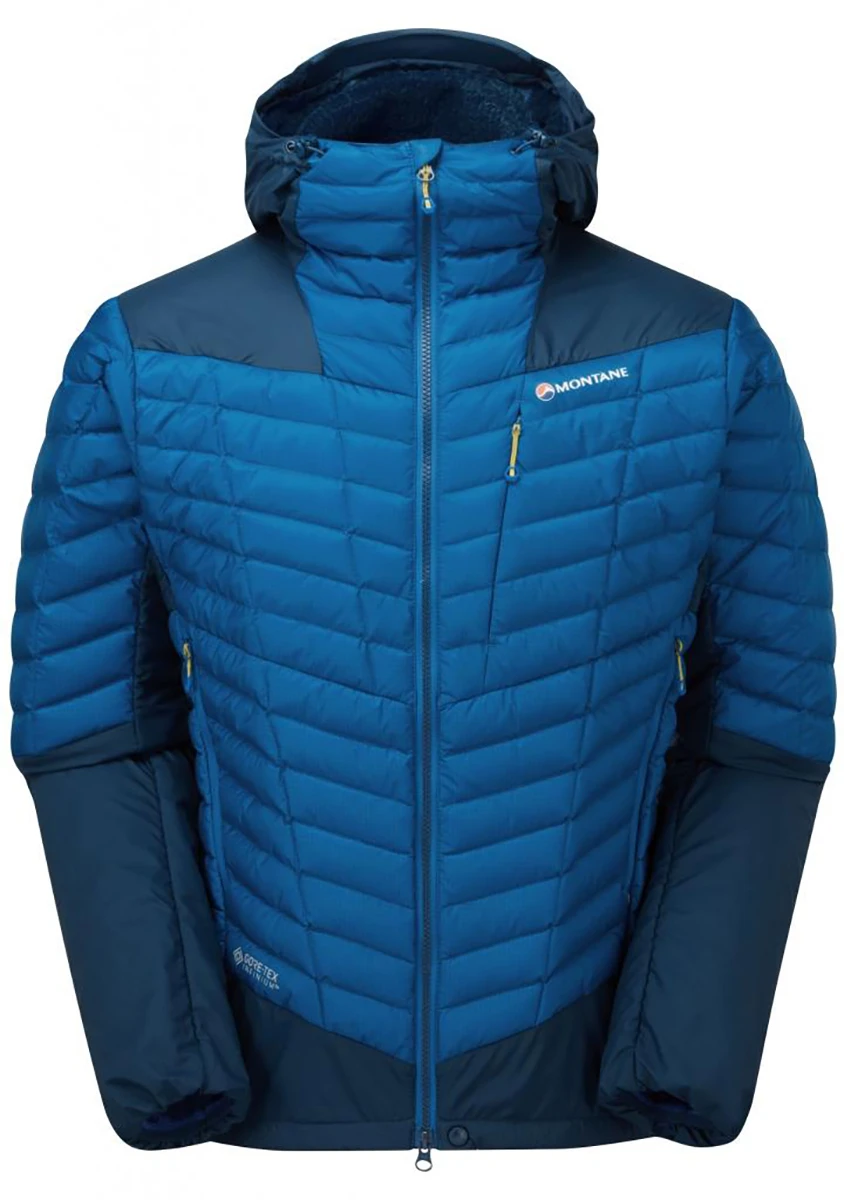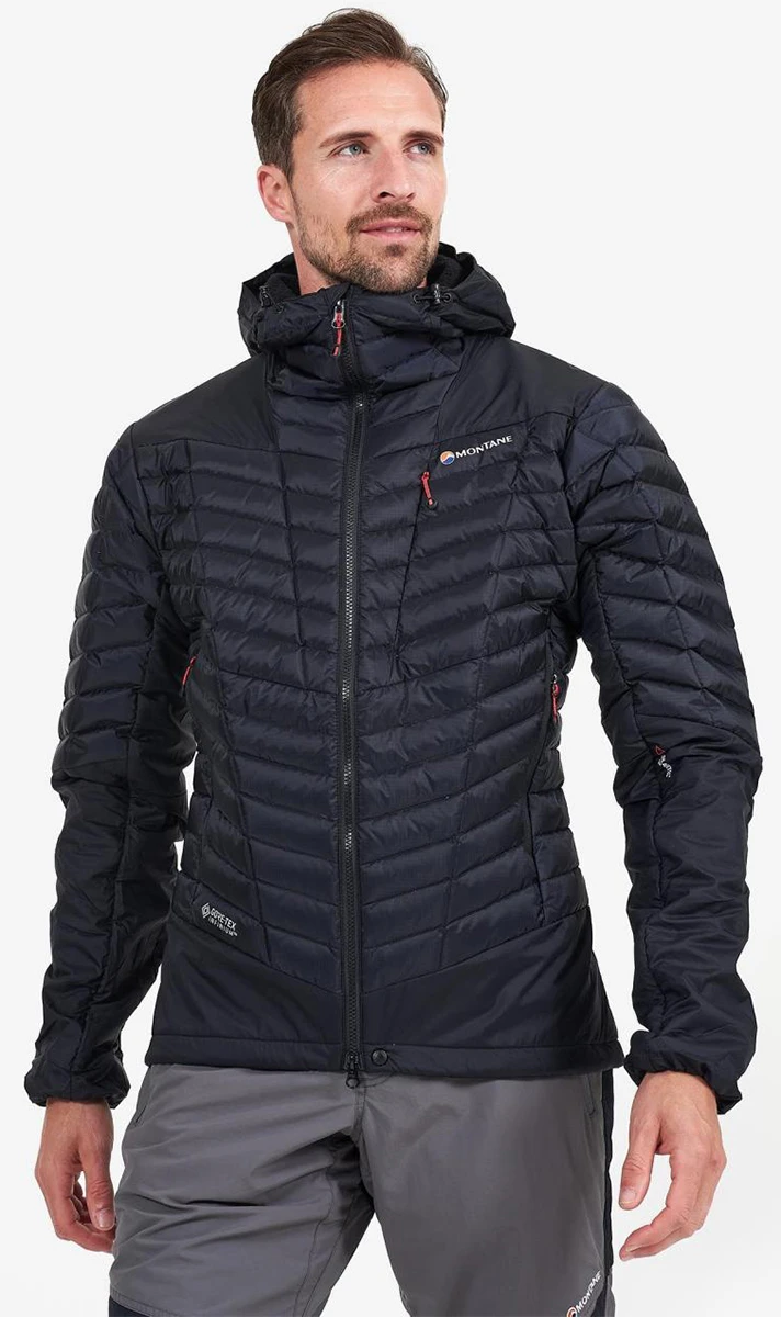 Montane Axis Alpha Jacket - je membránová, lehká (505 g), pánská bunda plněná kvalitním husím peřím. Tato péřová bunda využívá spolehlivou membránu Gore-tex Infinium (na přední straně a na rukávech + kapuci), která je nalaminovaná na Pertex Quantum Air. Je to velmi lehká svrchní tkanina, která nesnižuje loft izolační náplni.
