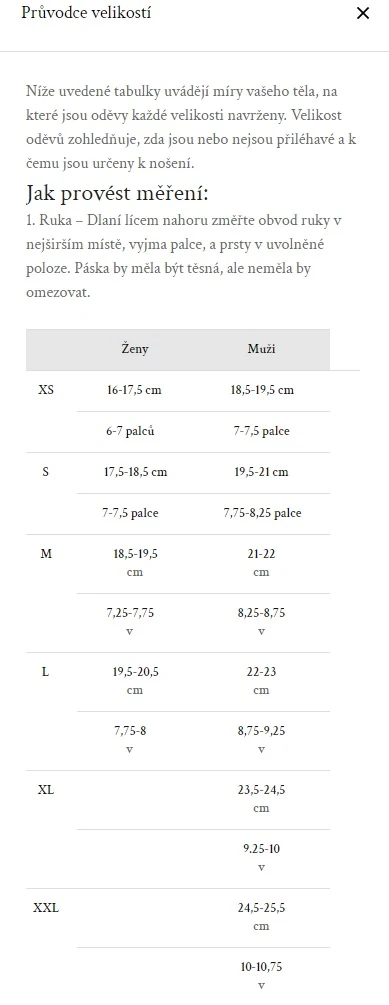 Tabulku velikostí rukavic najdete ve fotografiích.