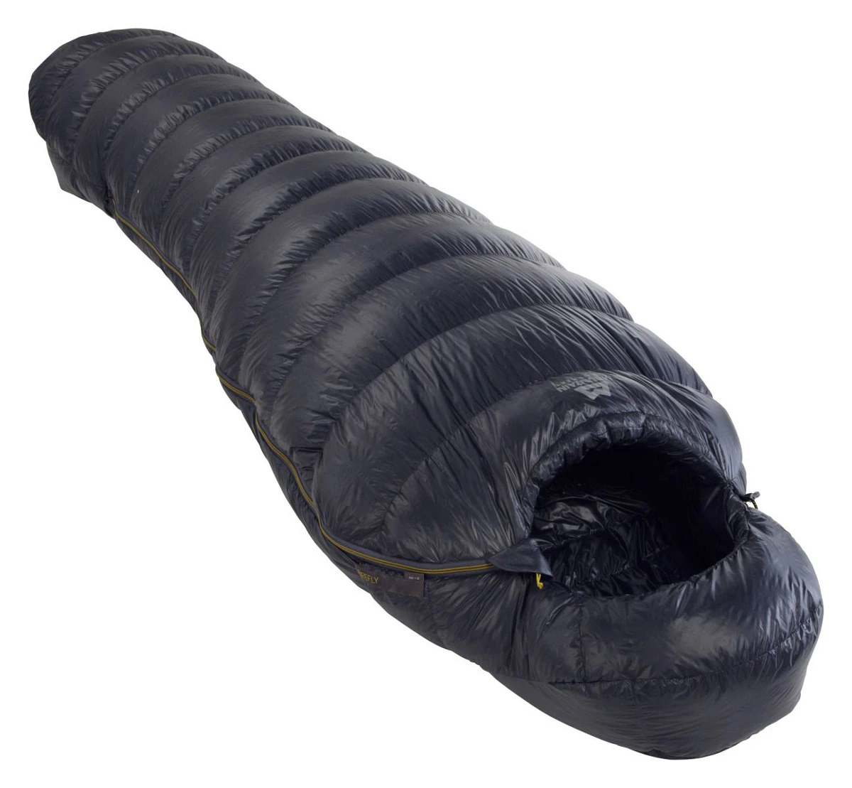 Mountain Equipment Firefly: je zajímavý extrémně nízkou hmotností, má pouze 550 g. Přitom má komfort 4°C. Díky tomu je to péřový spacák, který se hodí pro využití v letních dnech a na konci jara nebo začátkem podzimu.