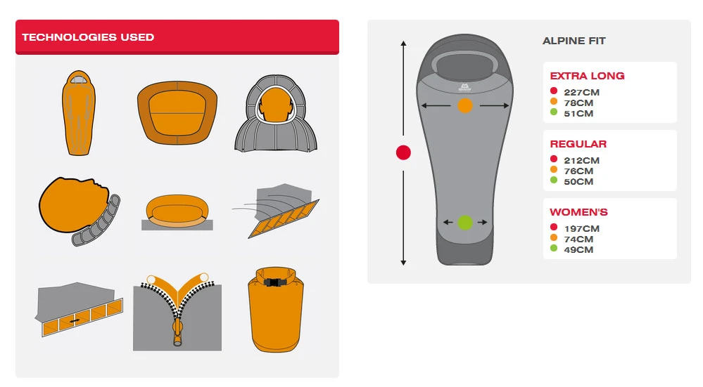 U spacího pytle je dobře vyřešen límec, tak aby neunikalo teplo. Kapuce je ergonomická a má 5 komor. Lichoběžníková konstrukce komor, které udržují peří tam, kde má být. V oblasti nohou jsou 4 komory, které zajistí maximální izolaci nohám. Zip je dvousměrný. Spacák je dodáván s nepromokavým obalem a síťkou na uskladnění.