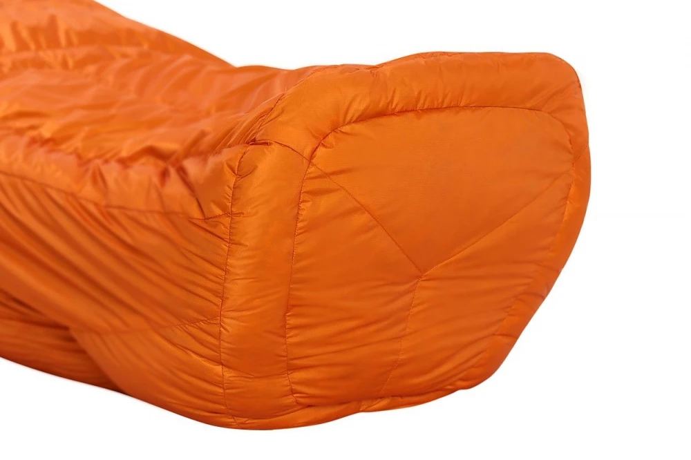 Spodní část spacáku kopíruje tvar chodidel při spánku. Dno spacáku je zkosené, je ve tvaru lichoběžníku a oblast špiček je zvýšená jako žraločí ploutev. Díky tomuto ergonomickému tvaru, nestláčíte chodidly komory v oblasti nohou a neztrácejí se tak izolační vlastnosti, které vaše nohy drží v teple. Dno spacáku je tvořeno z nejteplejších V-komor.