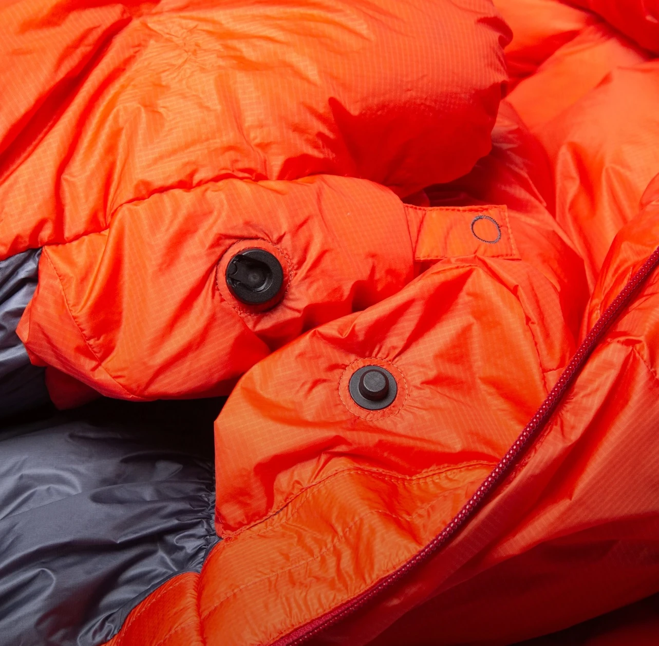 3D kapuce má 7 komor, které zabrání migraci peří, chrání hlavu před ztrátou tepla. Podle tvaru šňůrky víte, jestli stahujete horní část kapuce (plochá šňůrka), nebo spodní část kapuce (kulatá šňůrka).
