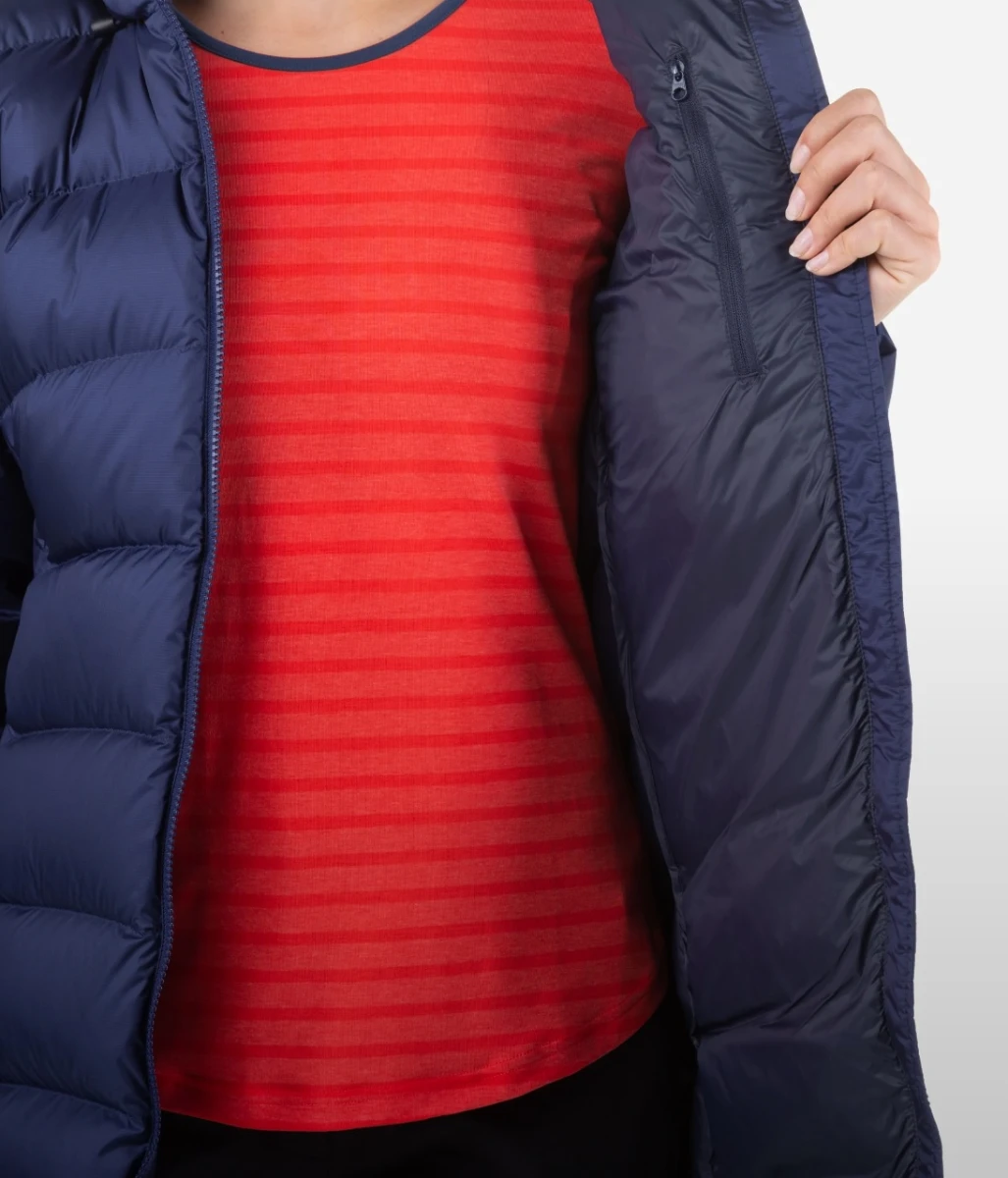 Vnitřní výplň bundy je z vysoce kvalitního kachního peří s plnivostí 700 cuin. Lightline Eco Women's Jacket byla navržena s maximální ohledem na životní prostředí, proto zde najdete recyklované peří s minimální hmotností 296g (u velikosti M).