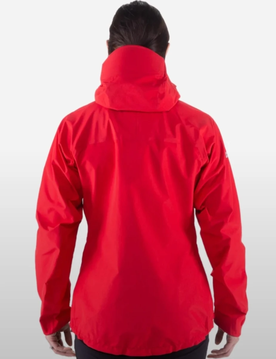 Tato dámská nepromokavá bunda je vyrobena z třívrstvého laminátu 40 D, který znamená dobrou odolnost proti poškození. Do kapuce se vejde i lezecká přilba. V rámci své kategorie, odolných nepromokavých bund si zachovává dobrou hmotnost. Kapsy jsou posazené výš pro využití se sedákem, má odvětrávání v podpaží.