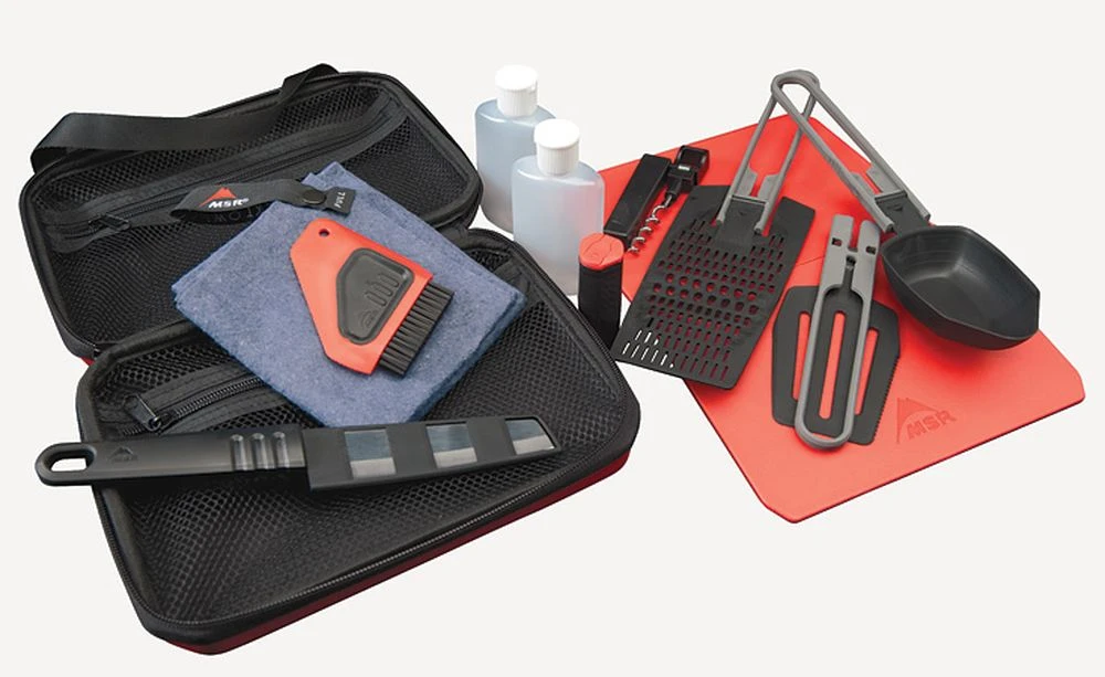 MSR Alpine Deluxe Kitchen Set: je kempingová sada určená pro vaření nebo do kuchyně v přírodě. Sada je uložené v odolném a omyvatelném obalu. Obsahuje outdoorový nůž, prkénko, vývrtku na víno, slánku, pepřenku a další nástroje.