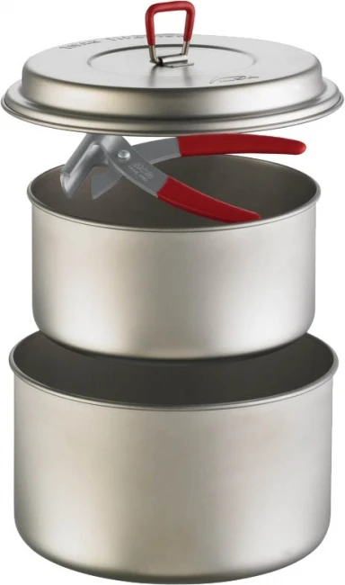 Čtyřdílný set kempingového nádobí MSR Titan 2 Pot Set: je lehká, velmi praktická, titanová souprava složená ze dvou hrnců o objemu 1l a 1,5 l, pokličky použitelné jako talíř, kleští a obalu. K této soupravě lze k dokoupit konvici. Všechny nádoby se dají složit do jednoho celku.