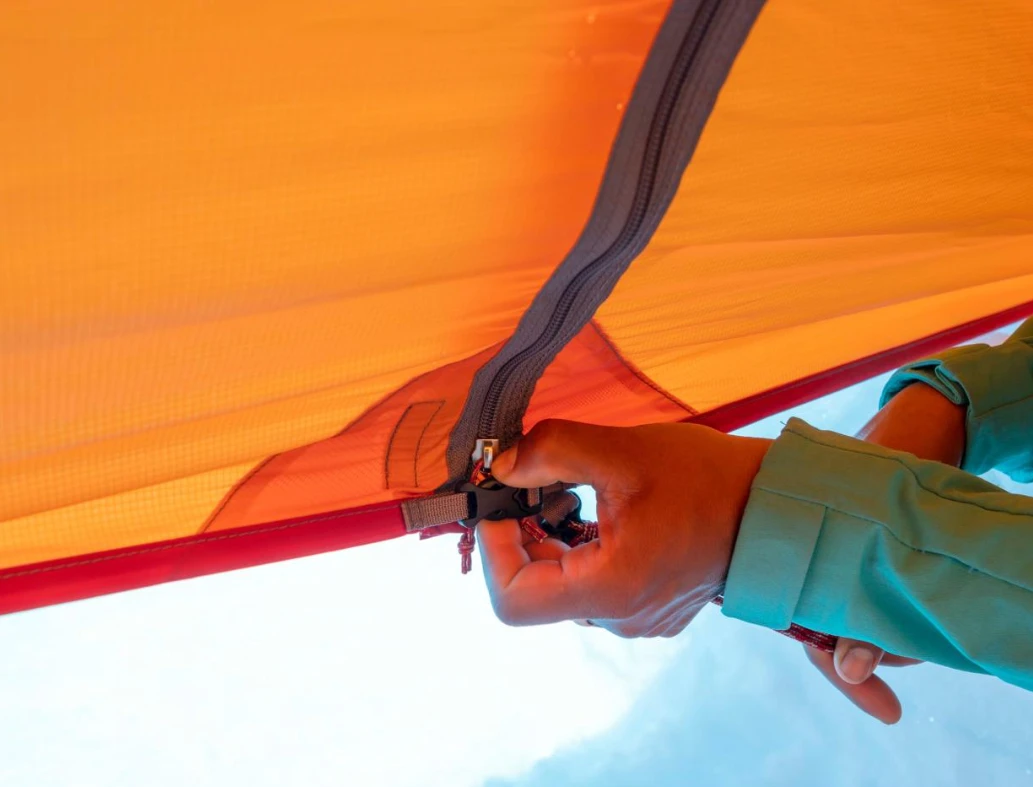 Dveře se zipem lze otevřít po celé délce pro volný vstup. Přístřešek je bez podlážky, snadno se sestaví pomocí trekových/lyžařských hůlek. Součástí balení jsou popruhy pro snadné ukotvení.