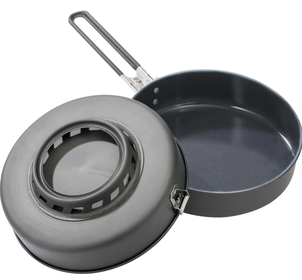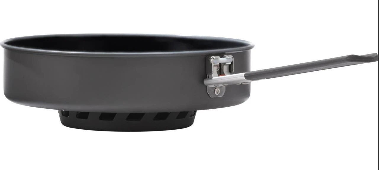MSR WindBurner Ceramic Skillet: Praktická a skladná kempingová pánev, s vestavěným tepelným výměníkem. Objem pánve je dostačujících 2,5 litrů. Průměr je 20 cm, a výška pánve je 7 cm. Oblé hrany uvnitř pánve usnadňují míchání a obracení jídla. Ve spodní části najdete zabudovaný tepelný výměník, který efektivně přenáší teplo, a tím šetří při vaření čas i použitý plyn.