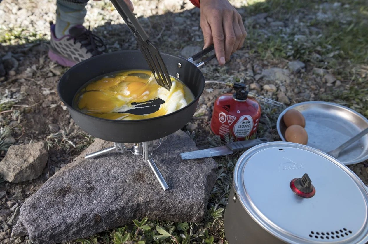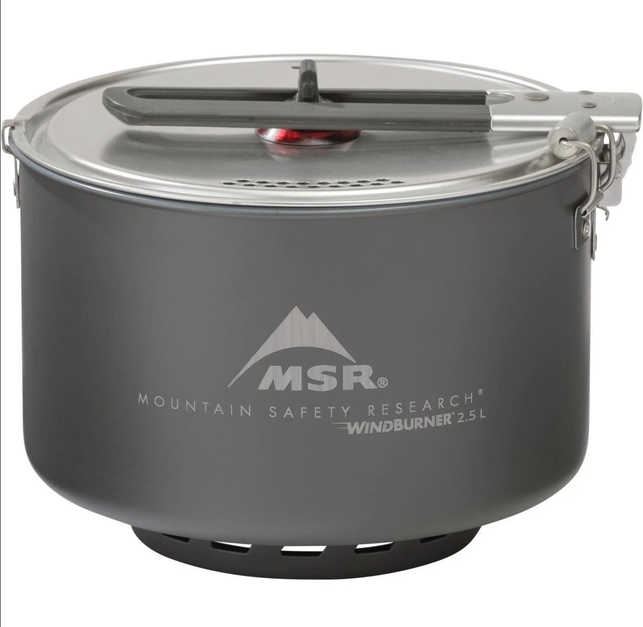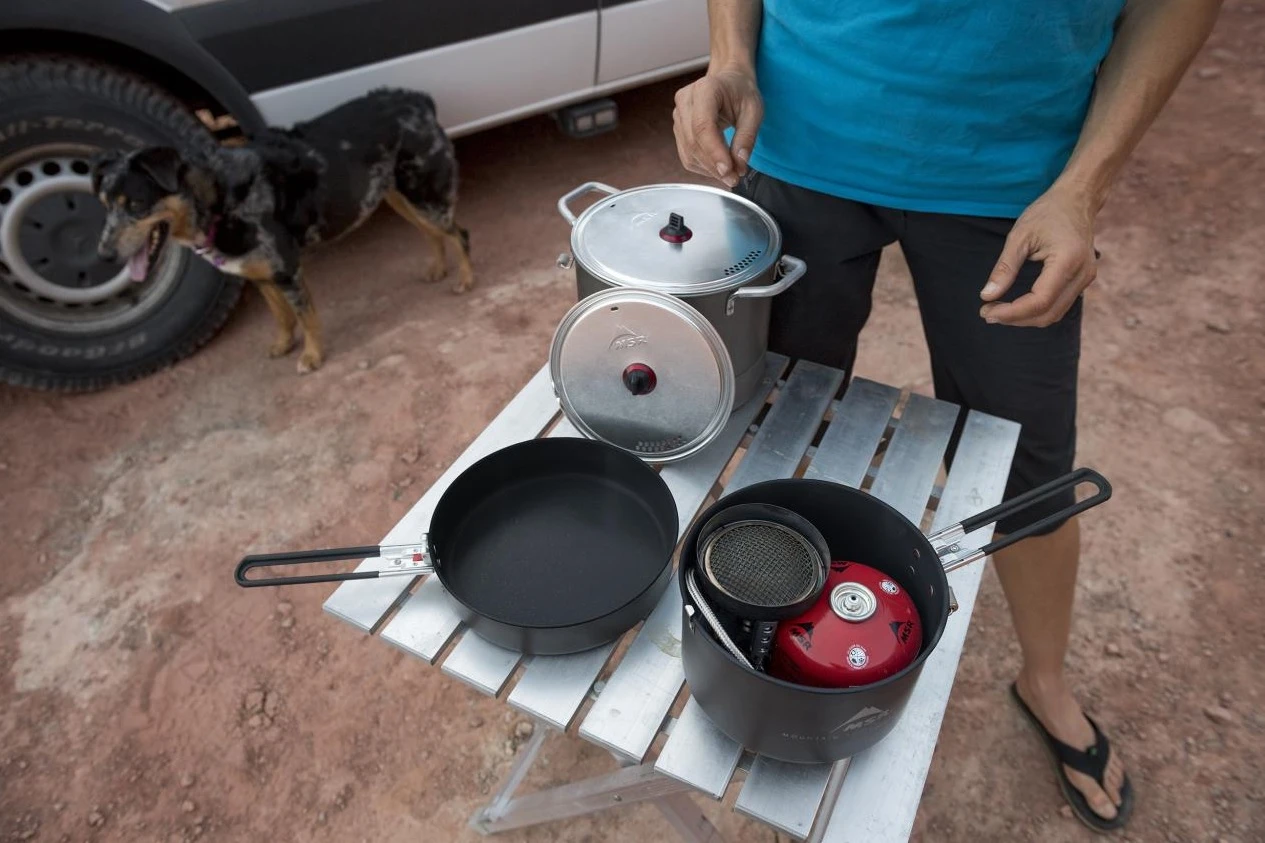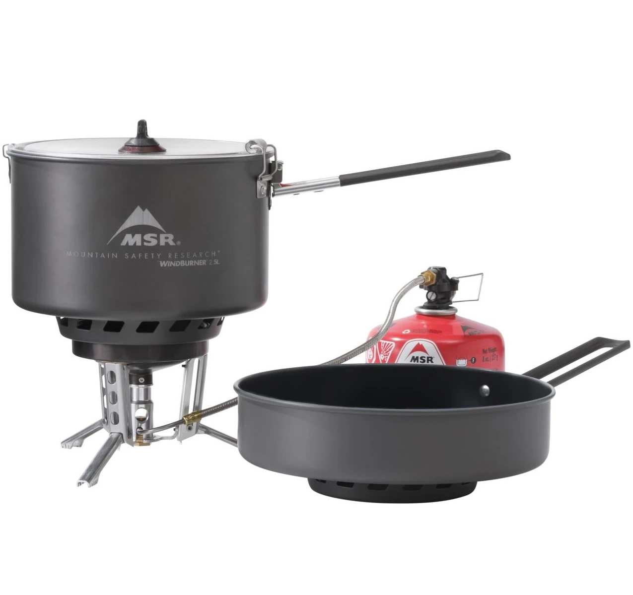 MSR WindBurner Stove System Combo: Sada na vaření do kempu, na výlety, cestování nebo spaní v autě. Sada se skládá z hrnce o objemu 2,5 l, pánve o průměru 20 cm, a plynového vařiče, využívající technologie sálavého tepla. Speciální pěna vydává sálavé teplo, které přechází pomocí tepelného výměníku přímo do nádoby. Díky tomu připravíte vaše jídlo i za nepříznivého počasí (silnější vítr), a ušetříte spotřebu plynu.