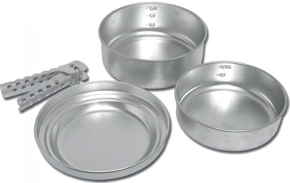 Alb Annapurna Hliníkové třídílné: je třídílný ešus pro dvě osoby, který obsahuje 3 nádoby (dva hrnce a miska - víčko). Povrch je eloxovaný, odděluje hliník od potravin. Elox má tvrdý povlak.