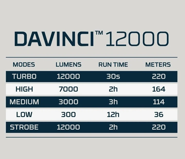 NEBO Davinci 12000: je dobíjecí, vodotěsná svítilna s 5 světelnými režimy, včetně turbo režimu 12 000 lumenů. Svítilna má 2x zoom, Smart Power Control, ergonomickou pogumovanou rukojeť a šňůrku pro pohodlné přenášení.