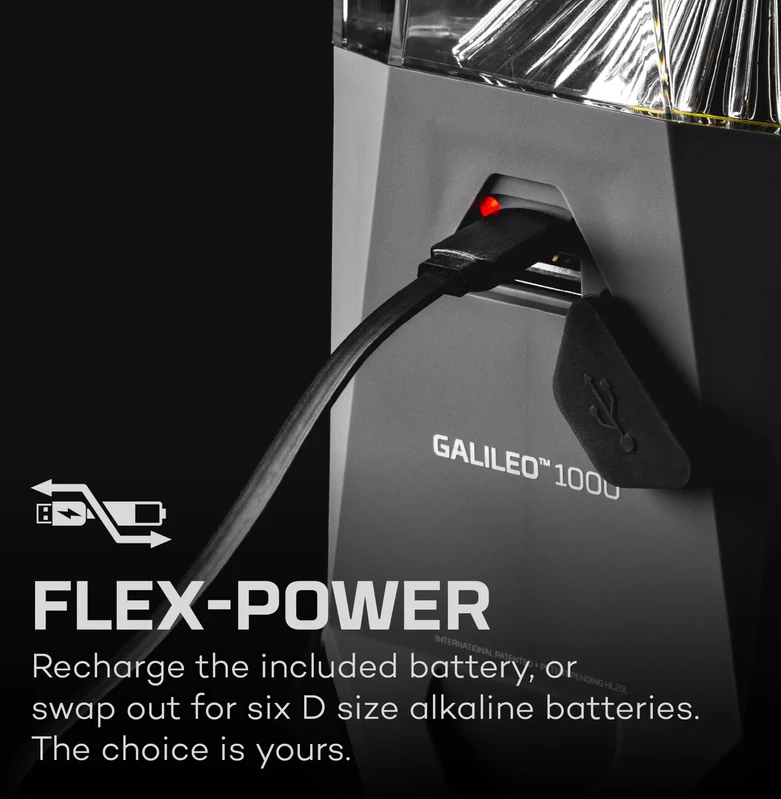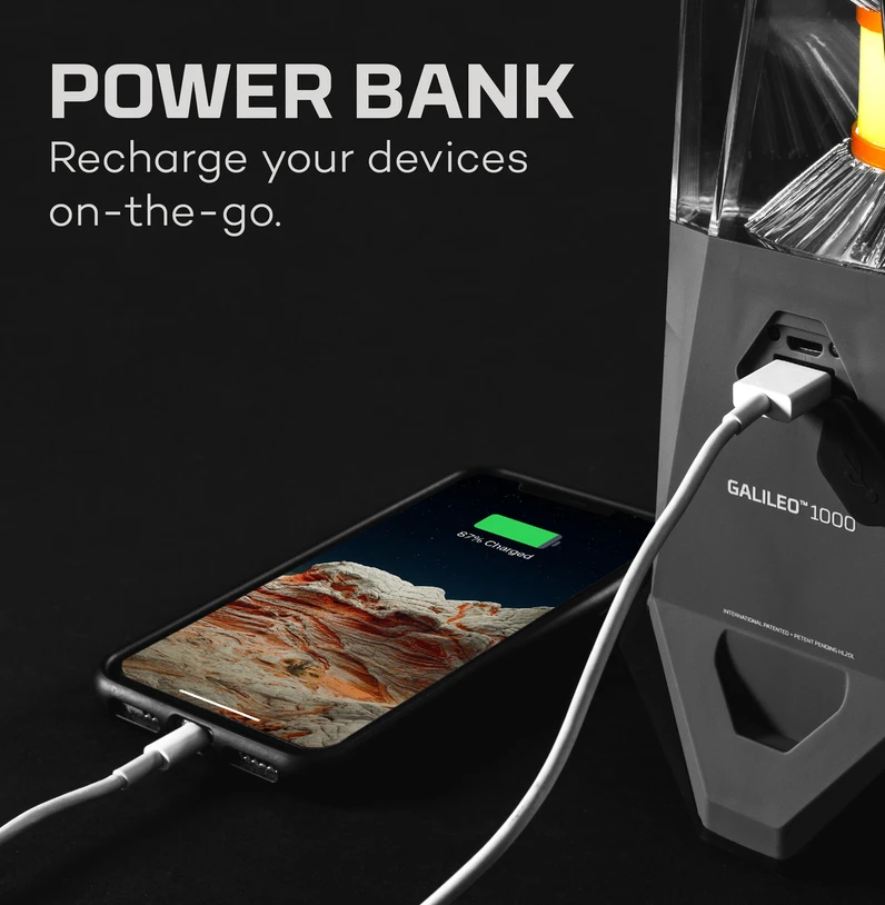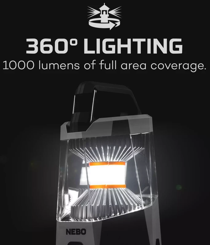 NEBO Galileo 1000: je dobíjecí svítilna o objemu 1 000 lumenů s 5 světelnými režimy s výstupním konektorem USB A pro napájení nebo nabíjení většiny zařízení USB. Součástí balení je rukojeť ve stylu karabiny pro pohodlné a bezpečné nošení. Předně umístěná tlačítka pro výběr napájení a režimu.
