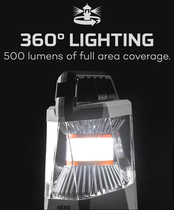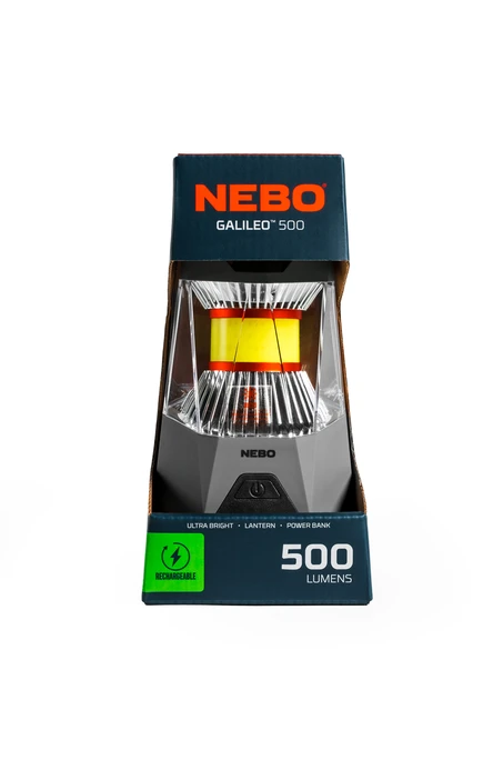 NEBO Galileo 500: je dobíjecí lucerna o výkonu 500 lumenů s více paprskovými vzory, stmíváním, přímou červenou, Smart Power Control a rukojetí ve stylu karabiny. Obsahuje výstupní konektor USB pro napájení nebo nabíjení většiny zařízení USB a rukojeť ve stylu karabiny.