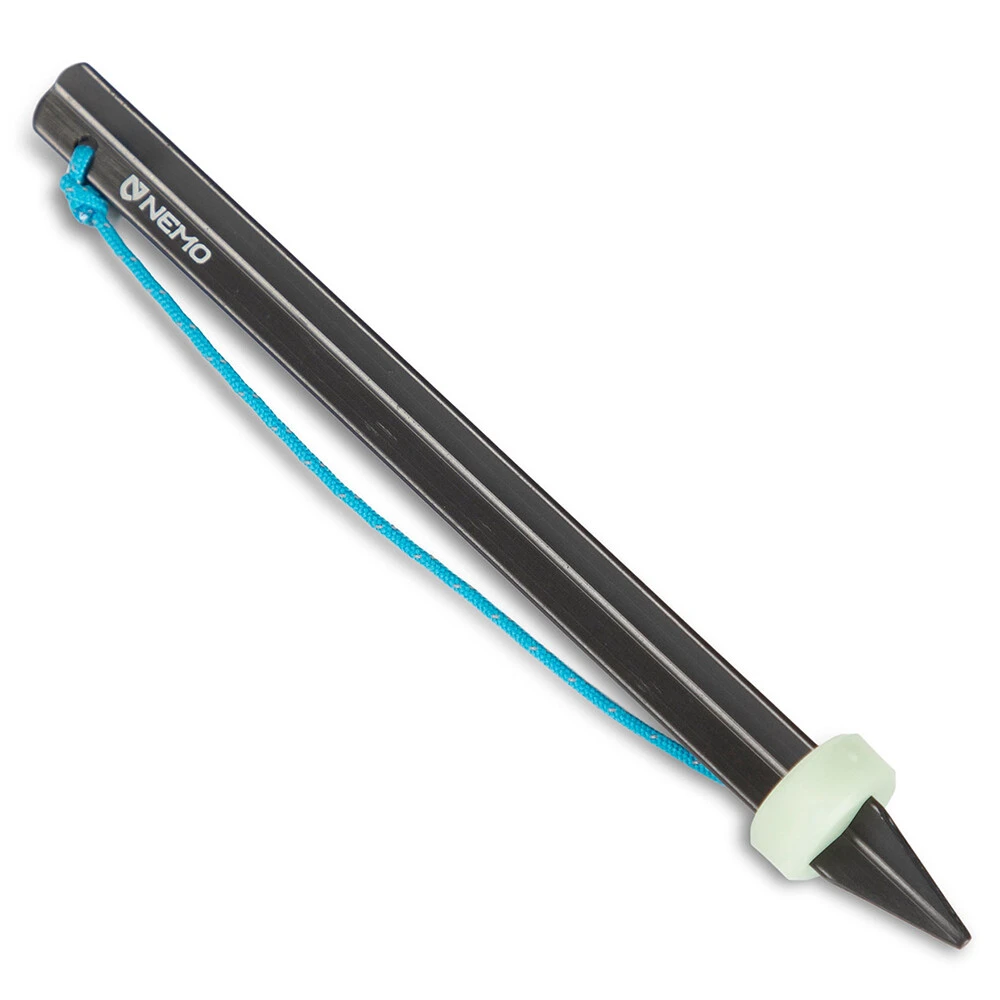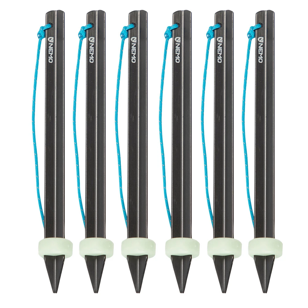 Nemo Equipment Sweepstake (6-Pack): sada stanových kolíků které výborně drží v různém terénu. Jsou opatřeny kroužkem z polymeru, který ve tmě fosforeskuje a kolík je tak dobře viditelný.