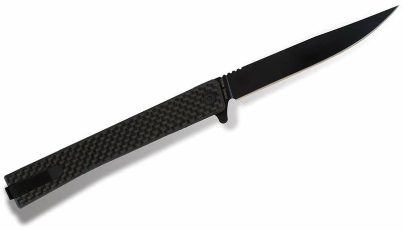 Rukojeť je vyrobena z leštěného karbonového vlákna, které je velmi lehké, ale zároveň dostatečně pevné a odolné. Čepel nože s černou PVD vrstvou je vyrobena z prvotřídní oceli S35VN.