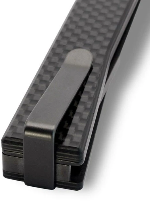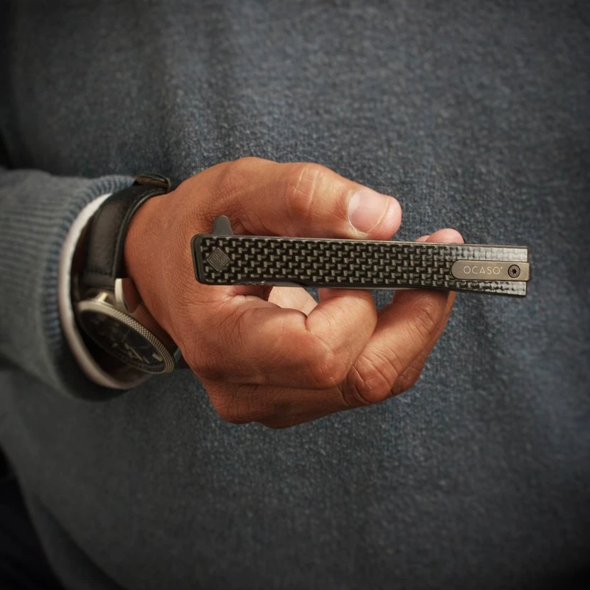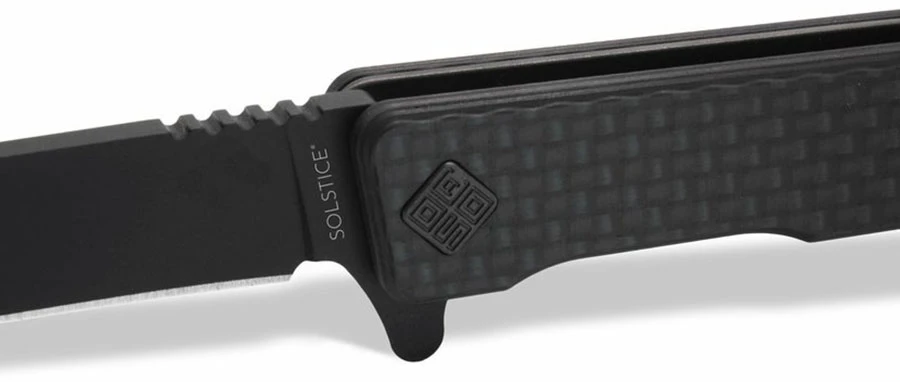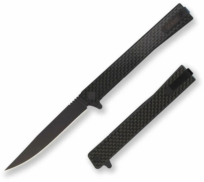 Ocaso Solstice Carbon Fiber + Black / Straight: velmi lehký a tenký zavírací nůž který zaujme svým elegantním vzhledem. Ocelová spona umožní aby nůž zapadl hlouběji do kapsy a byl méně nápadný, můžete ho tak nosit v kapse košile či saka hned vedle psacího pera.
