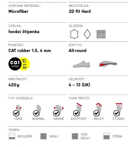 Díky lepičce CAT rubber 1,5 se hodí pro lezení na tření. Šněrování až do špičky, lezčky si můžete precizně dotáhnout. Tvrdá mezistélka zlepšuje jejich vlastnosti na menších stupech, zejména lištách.